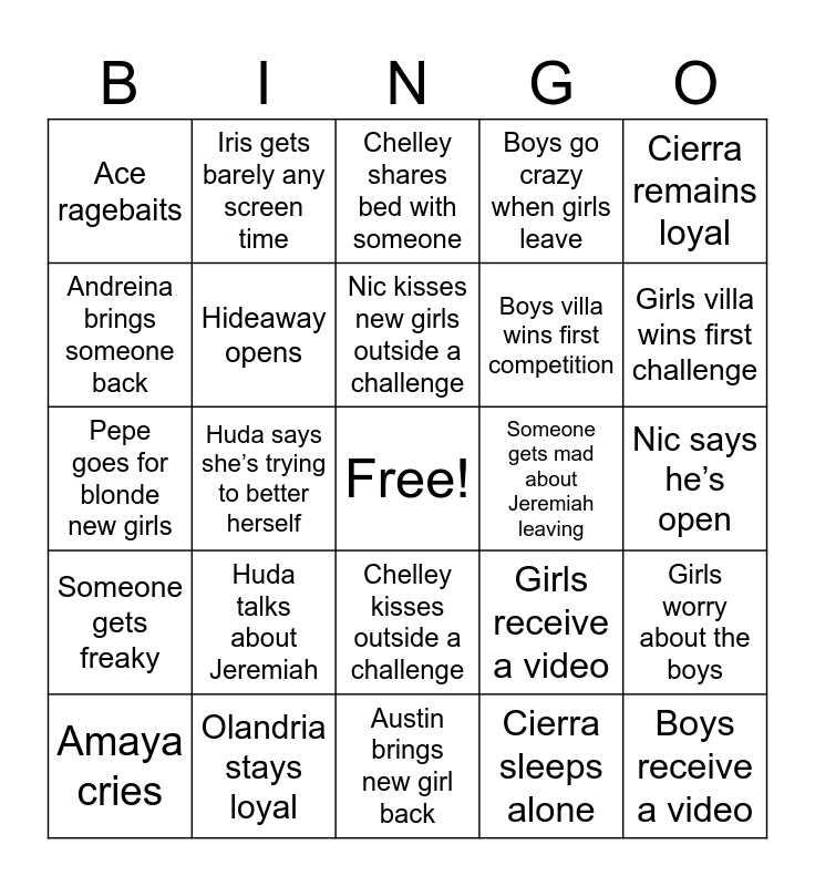This bingo card has a free space and 24 words: Huda talks about Jeremiah, Olandria stays loyal, Nic kisses new girls outside a challenge, Amaya cries, Cierra remains loyal, Ace ragebaits, Andreina brings someone back, Iris gets barely any screen time, Someone gets mad about Jeremiah leaving, Chelley kisses outside a challenge, Boys villa wins first competition, Pepe goes for blonde new girls, Girls receive a video, Girls worry about the boys, Hideaway opens, Cierra sleeps alone, Nic says he’s open, Chelley shares bed with someone, Girls villa wins first challenge, Huda says she’s trying to better herself, Boys receive a video, Someone gets freaky, Boys go crazy when girls leave and Austin brings new girl back.