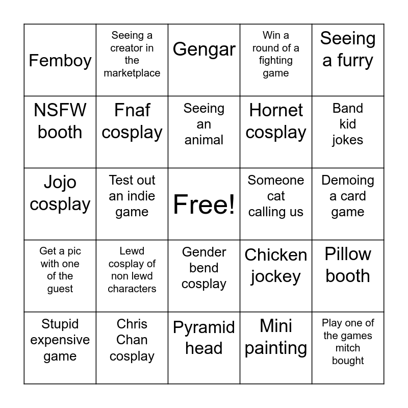 This bingo card has a free space and 24 words: Lewd cosplay of non lewd characters, Chris Chan cosplay, Seeing an animal, Stupid expensive game, Seeing a furry, Femboy, NSFW booth, Seeing a creator in the marketplace, Someone cat calling us, Gender bend cosplay, Hornet cosplay, Jojo cosplay, Chicken jockey, Pillow booth, Fnaf cosplay, Mini painting, Demoing a card game, Gengar, Band kid jokes, Test out an indie game, Play one of the games mitch bought, Get a pic with one of the guest, Win a round of a fighting game and Pyramid head.