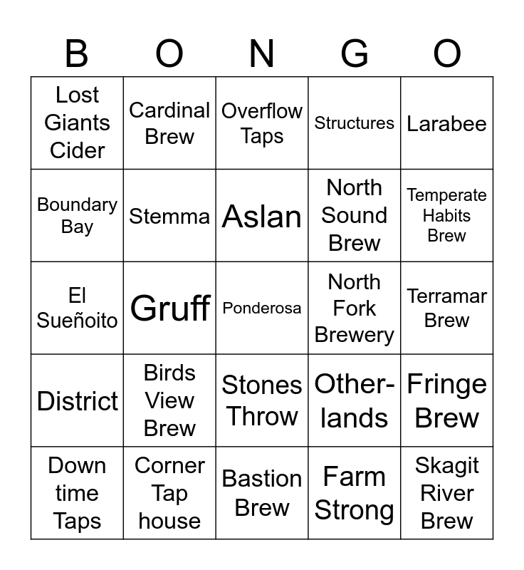This bingo card has 35 words: Kulshan, Menace, Wander, Stemma, Stones Throw, Structures, Boundary Bay, Beach Cat, Aslan, Fountain, El Sueñoito, Larabee, Honey Moon, Bellingham Cider Company, Lost Giants Cider, North Fork Brewery, Farm Strong, Gruff, District, Ponderosa, Other-lands, Down time Taps, Fringe Brew, Corner Tap house, Overflow Taps, Temperate Habits Brew, Skagit River Brew, Chuckanut Brew, North Sound Brew, Terramar Brew, La Conner Brew, Bastion Brew, Birds View Brew, Cardinal Brew and SAAL Brew.
