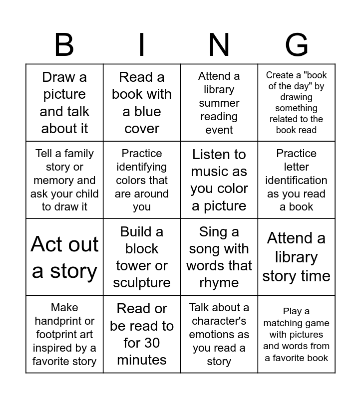 This bingo card has 16 words: Read or be read to for 30 minutes, Attend a library story time, Attend a library summer reading event, Draw a picture and talk about it, Act out a story, Read a book with a blue cover, Sing a song with words that rhyme, Talk about a character's emotions as you read a story, Tell a family story or memory and ask your child to draw it, Practice identifying colors that are around you, Make handprint or footprint art inspired by a favorite story, Create a "book of the day" by drawing something related to the book read, Build a block tower or sculpture, Practice letter identification as you read a book, Listen to music as you color a picture and Play a matching game with pictures and words from a favorite book.