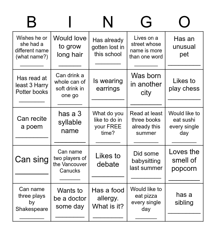 This bingo card has a free space and 24 words: Can name three plays by Shakespeare ________, Can name two players of the Vancouver Canucks _______, Is wearing earrings _________, Would like to eat pizza every single day _______, Has an unusual pet _________, Wishes he or she had a different name (what name?) ________, Would love to grow long hair ______, Has already gotten lost in this school ________, Read at least three books already this summer ________, Would like to eat sushi every single day ________, Can recite a poem _________, Can drink a whole can of soft drink in one go ________, Did some babysitting last summer _________, Loves the smell of popcorn ________, Has read at least 3 Harry Potter books ________, Wants to be a doctor some day ________, Has a food allergy. What is it? ________, Lives on a street whose name is more than one word ________, Likes to play chess _________, Can sing _______, has a 3 syllable name ________, Likes to debate ________, Was born in another city ________ and has a sibling _________.