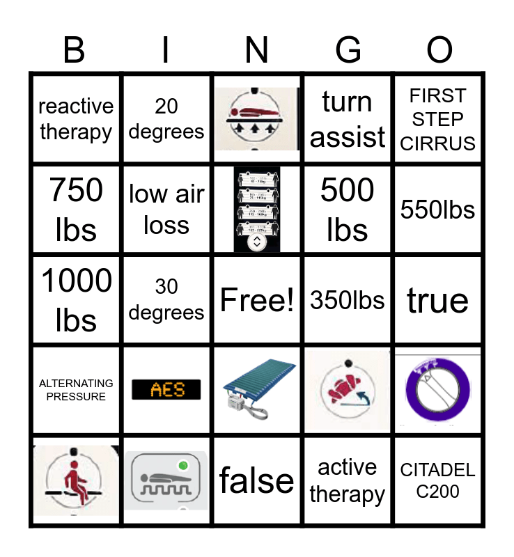This bingo card has 10 images, a free space and 20 words: SKIN IQ, 30 degrees, 300lbs, reactive therapy, low air loss, 350lbs, false, true, CITADEL C200, active therapy, MAXXAIR ETS, 550lbs, 25 degrees, ALTERNATING PRESSURE, FIRST STEP CIRRUS, 1000 lbs, 20 degrees, 500 lbs, 750 lbs and turn assist.