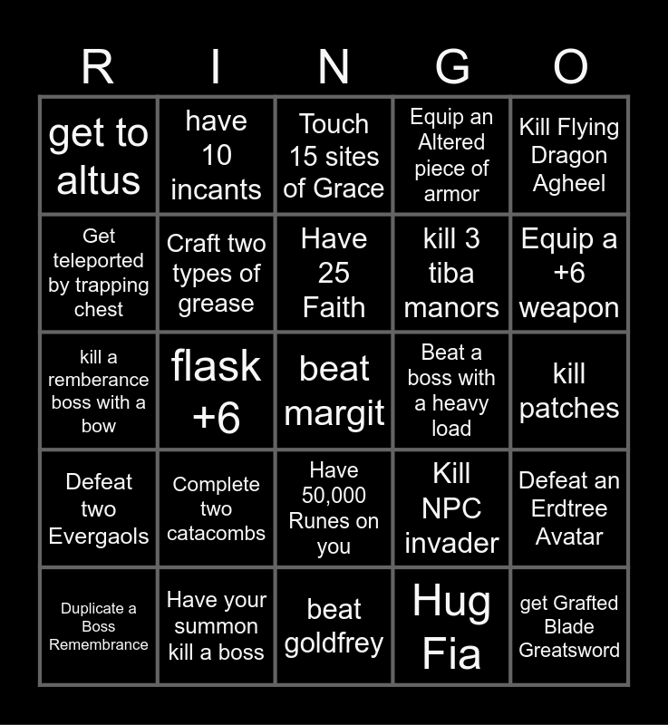 This bingo card has a free space and 24 words: Duplicate a Boss Remembrance, Complete two catacombs, Have 25 Faith, Hug Fia, Kill Flying Dragon Agheel, get to altus, have 10 incants, Touch 15 sites of Grace, Beat a boss with a heavy load, kill patches, kill a remberance boss with a bow, Craft two types of grease, Kill NPC invader, Defeat an Erdtree Avatar, Get teleported by trapping chest, Have your summon kill a boss, beat goldfrey, Equip an Altered piece of armor, Equip a +6 weapon, Defeat two Evergaols, flask +6, Have 50,000 Runes on you, kill 3 tiba manors and get Grafted Blade Greatsword.