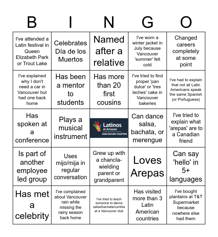 This bingo card has a free space and 32 words: Has visited more than 3 Latin American countries, Has a family recipe passed down for generations, Plays a musical instrument, Volunteers in their community, Is part of another employee led group, Has been a mentor to students, Changed careers completely at some point, Can say 'hello' in 5+ languages, Celebrates Día de los Muertos, Knows regional slang from different Latin American countries, Has more than 20 first cousins, Named after a relative, Has twins in their family, Has run a marathon/half marathon, Can dance salsa, bachata, or merengue, Has appeared on TV/radio, Has met a celebrity, Has spoken at a conference, Grew up with a chancla-wielding parent or grandparent, Uses mijo/mija in regular conversation, Loves Arepas, Explains to others how Xmas presents come from Baby Jesus, I've tried to explain what 'arepas' are to a Canadian friend, I've complained about Vancouver rain while missing the rainy season back home, I've bought plantains at T&T Supermarket because nowhere else had them, I've worn a winter jacket in July because Vancouver 'summer' felt cold, I've tried to find proper 'pan dulce' or 'tres leches' cake in Vancouver bakeries, I've explained why I don't need a car in Vancouver but had one back home, I've attended a Latin festival in Queen Elizabeth Park or Trout Lake, I've tried to teach someone to dance salsa/bachata/cumbia at a Vancouver club, I've sent maple syrup or salmon back home as 'typical Canadian gifts' and I've had to explain that not all Latin Americans speak the same Spanish (or Portuguese).