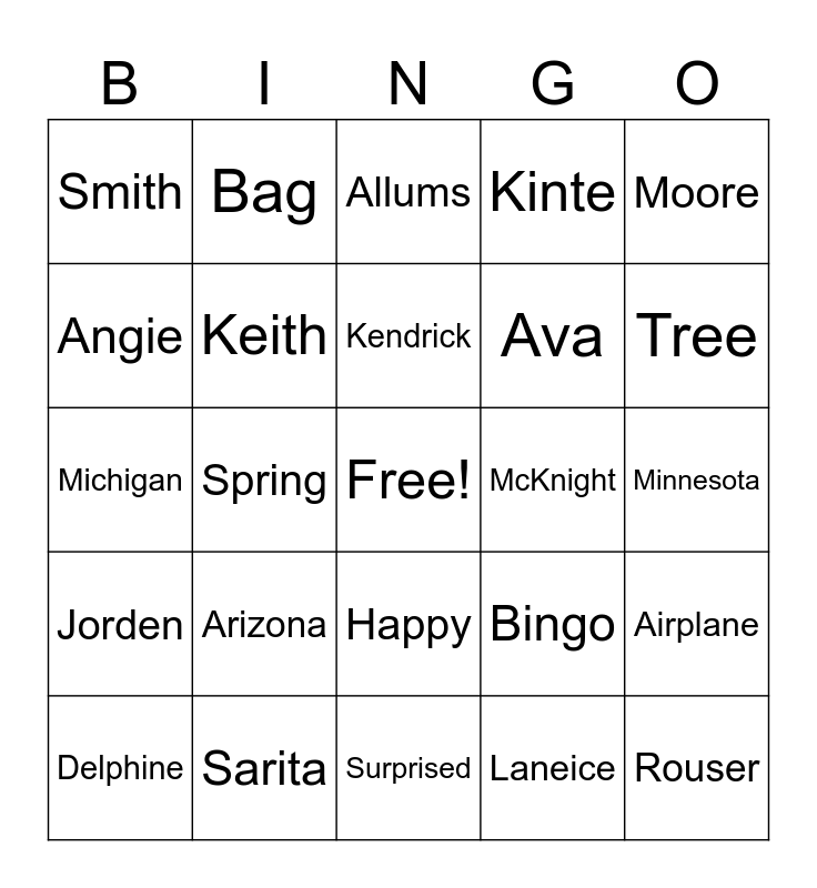 This bingo card has a free space and 59 words: L'Rhonda, Sarita, Kessiah, Jorden, Laneice, Donecia, Keith, Leta, Ava, Jerry, Kinte, Angel, Angie, Alena, Kevin, Smith, Rouser, Moore, Kenyell, Kendrick, McKnight, Allums, Delphine, Airplane, Chicken nuggets, Onyx, Jimmy, Silver rock, Tree, Tripple, People, Cars, Bus, Train, Bag, Summer, Winter, Spring, Fall, Michigan, Indiana, Arizona, Minnesota, Hockey, Anxiety, Envy, Disgust, Fear, Happy, Surprised, Excited, Embarrassed, Joy, Michael, Fan, Bingo, Slime, Suitcase and Pupil.