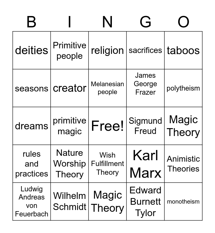 This bingo card has a free space and 29 words: Ludwig Andreas von Feuerbach, myth, primitive magic, holy place, deities, religion, creator, Nature Worship Theory, Sigmund Freud, Wilhelm Schmidt, Magic Theory, monotheism, Magic Theory, Edward Burnett Tylor, polytheism, Original Monotheism, Wish Fulfillment Theory, rules and practices, taboos, dreams, Karl Marx, mana, James George Frazer, seasons, sacrifices, Primitive people, Animistic Theories, Melanesian people and science.