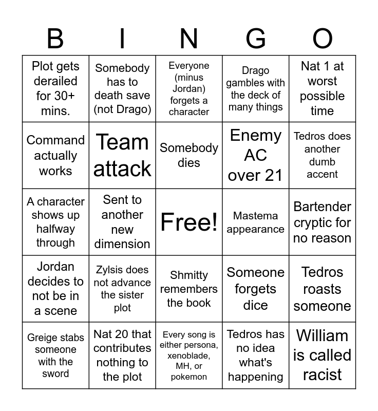 This bingo card has a free space and 44 words: Saira is a gooner, William is called racist, Wy ignores Saira again, Greige stabs someone with the sword, A Pushka shows up, Tedros has no idea what's happening, Everyone (minus Jordan) forgets a character, Legendary Resistance, Nat 1 at worst possible time, Nat 20 that contributes nothing to the plot, Drago gambles with the deck of many things, Mastema appearance, Shmitty remembers the book, Zylsis does not advance the sister plot, Nobody cares about the current villain, Every song is either persona, xenoblade, MH, or pokemon, Sidequest, A character shows up halfway through, New Saira animal, Tedros does another dumb accent, Somebody has to death save (not Drago), William only uses greatsword in a battle, Wy actually likes Saira??, Plot gets derailed for 30+ mins., Doul fight, Bartender cryptic for no reason, Drago at 1HP, Alec Schizo character, Someone forgets dice, Jordan decides to not be in a scene, Wy cooks, Tedros roasts someone, (he who shall not be named) dragon, Character gets emo about their tragic backstory, Sent to another new dimension, Robert is randomly related to someone, Robert has a tragic backstory that nobody cares about, Boss phase 2, Somebody dies, Command actually works, Enemy AC over 21, Lux & Viat cameo, Team attack and Someone remembers a plot point from like 3 years ago (not Jordan).