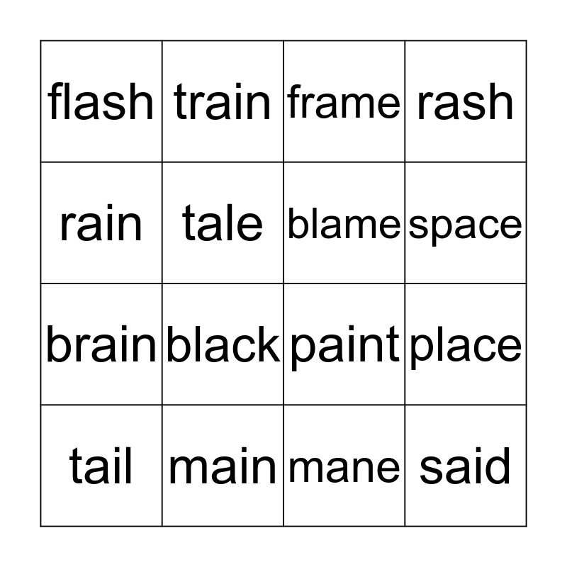 This bingo card has a free space and 15 words: tail, said, frame, flash, space, rain, black, mane, tale, brain, place, rash, blame, train and main.