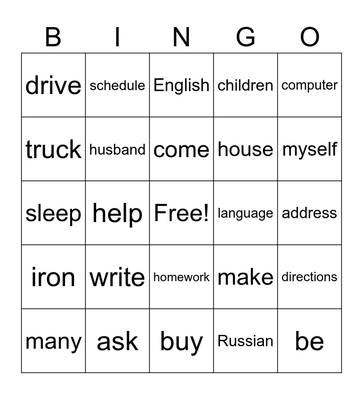 This bingo card has a free space and 70 words: classmate, address, again, appointment, ask, child, children, class, computer, cook, directions, doctor, drive, English, give, help, homework, house, introduce, iron, language, make, myself, name, paint, price, read, register, Russian, say, schedule, shirt, shopping list, Spanish, speak, swim, talk, telephone number, television, truck, weekend, write, be, daughter, here, husband, many, marry, occupation, old, son, there, twin, year, buy, celebrate, come, country, do, go, sleep, stay, study, take, usually, very, visit, want, went (go) and work.