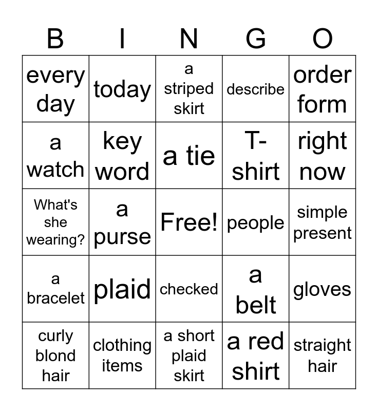 This bingo card has a free space and 44 words: long brown hair, straight hair, a jogging suit, curly blond hair, short hair, a red shirt, a striped skirt, soccer, order form, clothing items, describe, people, checked, plaid, striped, a short plaid skirt, a long black and white coat, What's she wearing?, now, right now, today, always, usually, every day, What are you doing right now?, simple present, present continuous, What do you do every Tuesday?, a belt, a bracelet, earrings, gloves, a hat, a necklace, a purse, a ring, a scarf, sunglasses, a tie, a watch, T-shirt, athletic, key word and Let's stay in touch..