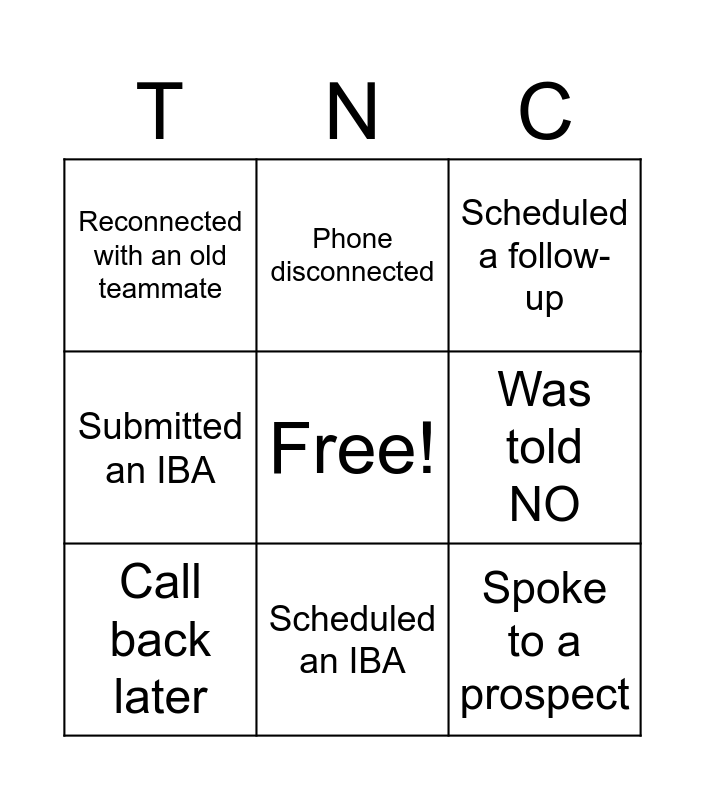 This bingo card has a free space and 24 words: Got voicemail, Got mtg invite, Scheduled an IBA, Got a commitment, Spoke to a prospect, Reconnected with an old teammate, Was told NO, Phone disconnected, Closed an app, Set an appointment, Sent a followup text, Got a referral, Wrong number, Got a reinstatement, Call back later, Left a voicemail, Got hung up on, Scheduled a follow-up, Got a NO, Got a mtg invite, Spoke to someone, Wrong number, Submitted an IBA and Got a response through text.