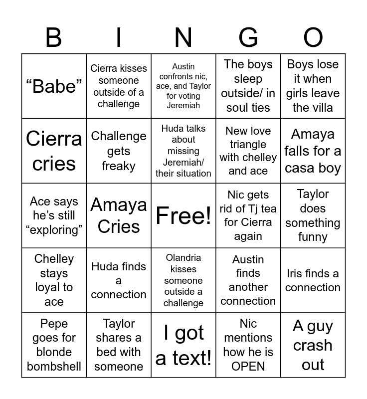 This bingo card has a free space and 24 words: Huda finds a connection, Taylor shares a bed with someone, Huda talks about missing Jeremiah/ their situation, Pepe goes for blonde bombshell, Boys lose it when girls leave the villa, “Babe”, Cierra cries, Cierra kisses someone outside of a challenge, Nic gets rid of Tj tea for Cierra again, Olandria kisses someone outside a challenge, New love triangle with chelley and ace, Ace says he’s still “exploring”, Austin finds another connection, Iris finds a connection, Challenge gets freaky, Nic mentions how he is OPEN, Taylor does something funny, Austin confronts nic, ace, and Taylor for voting Jeremiah, Amaya falls for a casa boy, Amaya Cries, A guy crash out, Chelley stays loyal to ace, The boys sleep outside/ in soul ties and I got a text!.