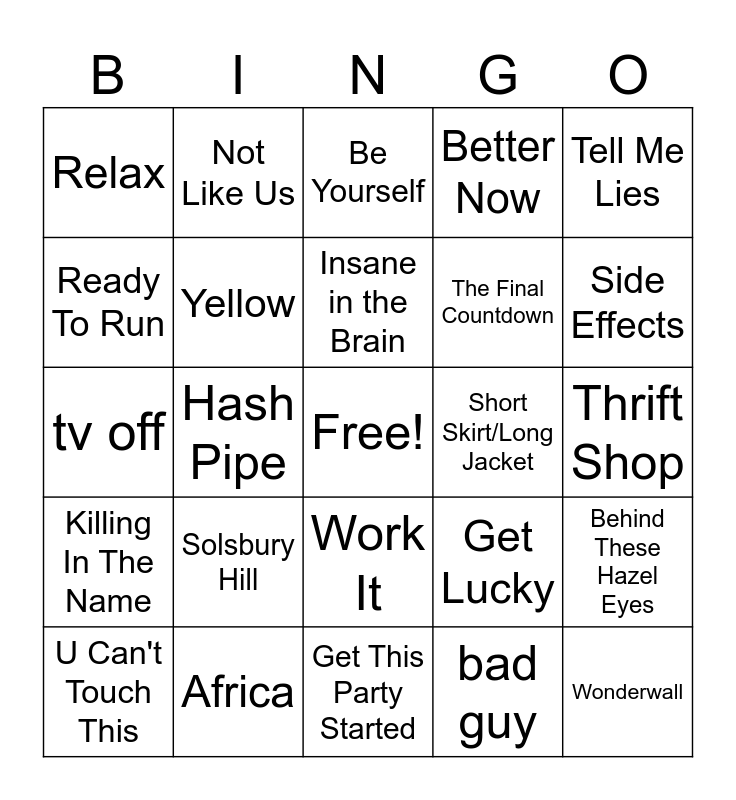 This bingo card has a free space and 75 words: Thunderstruck, Sweet Emotion, Be Yourself, So What'cha Want, Sabotage, Shake Your Rump, Crazy In Love, Save a Horse Ride a Cowboy, bad guy, The Stranger, All the Small Things, Livin' On A Prayer, Short Skirt/Long Jacket, Side Effects, Feels Like Summer, Yellow, 24K Magic, Get Lucky, Enjoy the Silence, Ready To Run, The Boys of Summer, Insane in the Brain, The Final Countdown, Tell Me Lies, Relax, Friends in Low Places, Hold On, We're Going Down, Clint Eastwood, Adore You, 99 Problems, Empire State of Mind, Faith, Running Up That Hill, Behind These Hazel Eyes, tv off, Not Like Us, SexyBack, The Rain Song, Thrift Shop, U Can't Touch This, Beat It, Mr Brightside, Smells Like Teen Spirit, Mo Money, Mo Problems, Jeremy, In The Air Tonight, Work It, Better Now, Creep, Please Don't Stop The Music, Angels, Get This Party Started, Vox, Man! I Feel Like a Woman, Drop It Like It's Hot, Black Hole Sun, Do Ya Think I'm Sexy, Santeria, Don't You Worry Child, Chop Suey!, Africa, Wannabe, With or Without You, Jump, Can't Feel My Face, Hash Pipe, Ahead By A Century, In Da Club, Bizarre Love Triangle, Killing In The Name, Solsbury Hill, Bust a Move, Canned Heat, Wonderwall and Red Rain.