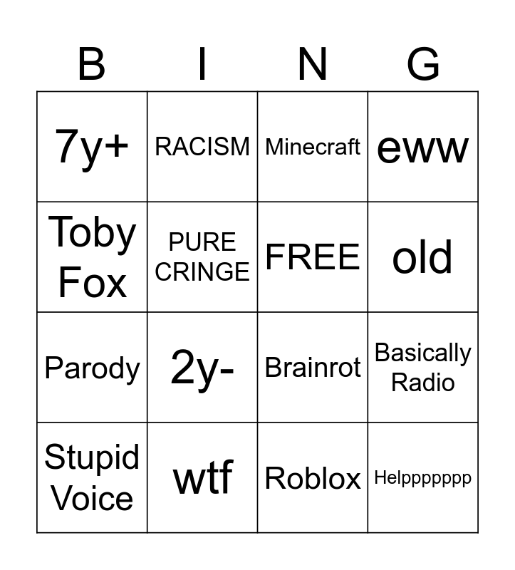 This bingo card has 16 words: wtf, Basically Radio, Minecraft, 7y+, Parody, RACISM, Brainrot, Roblox, Toby Fox, PURE CRINGE, Stupid Voice, eww, 2y-, old, FREE and Helppppppp.