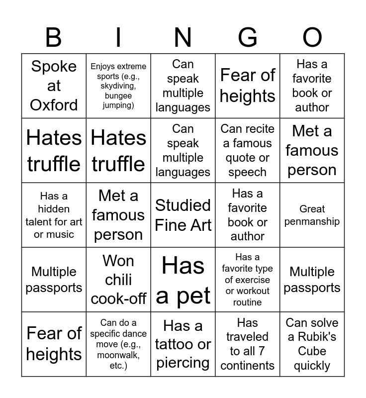 This bingo card has 37 words: Free!, Studied Fine Art, Great penmanship, Hates truffle, Multiple passports, Won chili cook-off, Can speak multiple languages, Has a pet, Has a favorite book or author, Spoke at Oxford, Met a famous person, Fear of heights, Studied Fine Art, Great penmanship, Hates truffle, Multiple passports, Won chili cook-off, Can speak multiple languages, Has a pet, Has a favorite book or author, Spoke at Oxford, Met a famous person, Fear of heights, Has a tattoo or piercing, Can play a musical instrument, Has traveled to all 7 continents, Enjoys extreme sports (e.g., skydiving, bungee jumping), Can recite a poem or song from memory, Has a unique collection (e.g., coins, stamps, etc.), Can speak in front of large groups without getting nervous, Has a favorite type of cuisine, Can do a specific dance move (e.g., moonwalk, etc.), Has a hidden talent for art or music, Can solve a Rubik's Cube quickly, Has a favorite type of exercise or workout routine, Can recite a famous quote or speech and Has a unique sense of style or fashion.