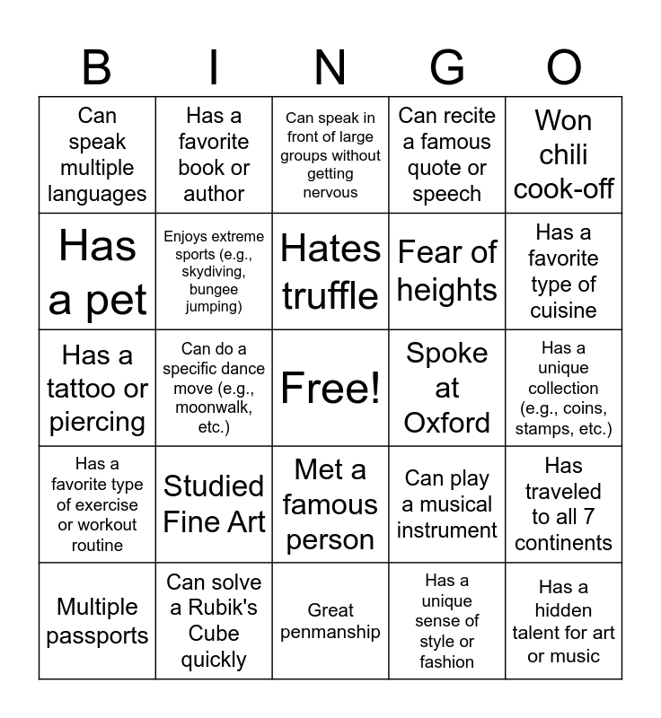 This bingo card has a free space and 25 words: Studied Fine Art, Great penmanship, Hates truffle, Multiple passports, Won chili cook-off, Can speak multiple languages, Has a pet, Has a favorite book or author, Spoke at Oxford, Met a famous person, Fear of heights, Has a tattoo or piercing, Can play a musical instrument, Has traveled to all 7 continents, Enjoys extreme sports (e.g., skydiving, bungee jumping), Can recite a poem or song from memory, Has a unique collection (e.g., coins, stamps, etc.), Can speak in front of large groups without getting nervous, Has a favorite type of cuisine, Can do a specific dance move (e.g., moonwalk, etc.), Has a hidden talent for art or music, Can solve a Rubik's Cube quickly, Has a favorite type of exercise or workout routine, Can recite a famous quote or speech and Has a unique sense of style or fashion.
