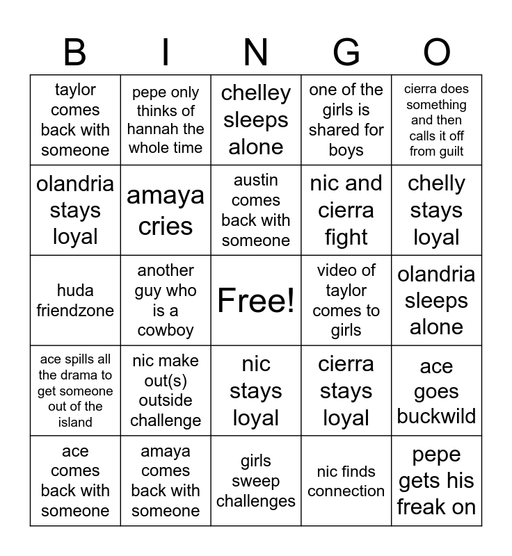 This bingo card has a free space and 24 words: nic make out(s) outside challenge, amaya comes back with someone, austin comes back with someone, ace comes back with someone, cierra does something and then calls it off from guilt, taylor comes back with someone, olandria stays loyal, pepe only thinks of hannah the whole time, video of taylor comes to girls, nic stays loyal, nic and cierra fight, huda friendzone, cierra stays loyal, ace goes buckwild, amaya cries, nic finds connection, olandria sleeps alone, chelley sleeps alone, chelly stays loyal, another guy who is a cowboy, pepe gets his freak on, ace spills all the drama to get someone out of the island, one of the girls is shared for boys and girls sweep challenges.