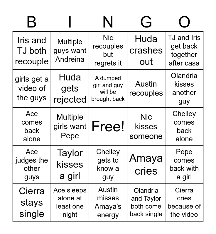 This bingo card has a free space and 24 words: Taylor kisses a girl, Ace sleeps alone at least one night, A dumped girl and guy will be brought back, Cierra stays single, TJ and Iris get back together after casa, Iris and TJ both recouple, girls get a video of the guys, Multiple guys want Andreina, Nic kisses someone, Chelley gets to know a guy, Austin recouples, Ace comes back alone, Amaya cries, Pepe comes back with a girl, Huda gets rejected, Olandria and Taylor both come back single, Chelley comes back alone, Nic recouples but regrets it, Olandria kisses another guy, Multiple girls want Pepe, Cierra cries because of the video, Ace judges the other guys, Huda crashes out and Austin misses Amaya's energy.