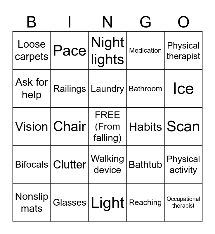 This bingo card has a free space and 58 words: Exercise, Glasses, Crowds, Bifocals, Reaching, Wet floor, Railings, Clear pathway, Bathroom, Fatigue, Medication, Blood pressure, Numbness, Hip fracture, Spills, Loose carpets, Occupational therapist, Physical therapist, Prevention, Laundry, Habits, Night lights, Nonslip mats, Physical activity, Hazards, Scan, Strength, Phone, Ice, Slippery surf, One in four, Contrast, Vitamin D, Age, Hydrate, Dizzy, Balance, Chair, Vision, Hearing, Clutter, Health, Bathtub, Home safety, Shoes, Cords, Bath seat, Walking device, Light, Grab bar, Feet, Fear, Turning, Plan, Pace, Rushing, Ask for help and Be Aware.