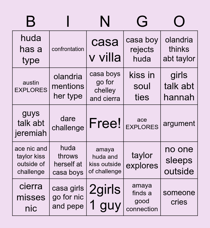 This bingo card has a free space and 24 words: huda throws herself at casa boys, casa girls go for nic and pepe, casa boys go for chelley and cierra, cierra misses nic, olandria thinks abt taylor, huda has a type, austin EXPLORES, confrontation, ace EXPLORES, amaya huda and kiss outside of challenge, kiss in soul ties, guys talk abt jeremiah, taylor explores, no one sleeps outside, olandria mentions her type, amaya finds a good connection, argument, casa v villa, girls talk abt hannah, dare challenge, someone cries, ace nic and taylor kiss outside of challenge, casa boy rejects huda and 2girls 1 guy.