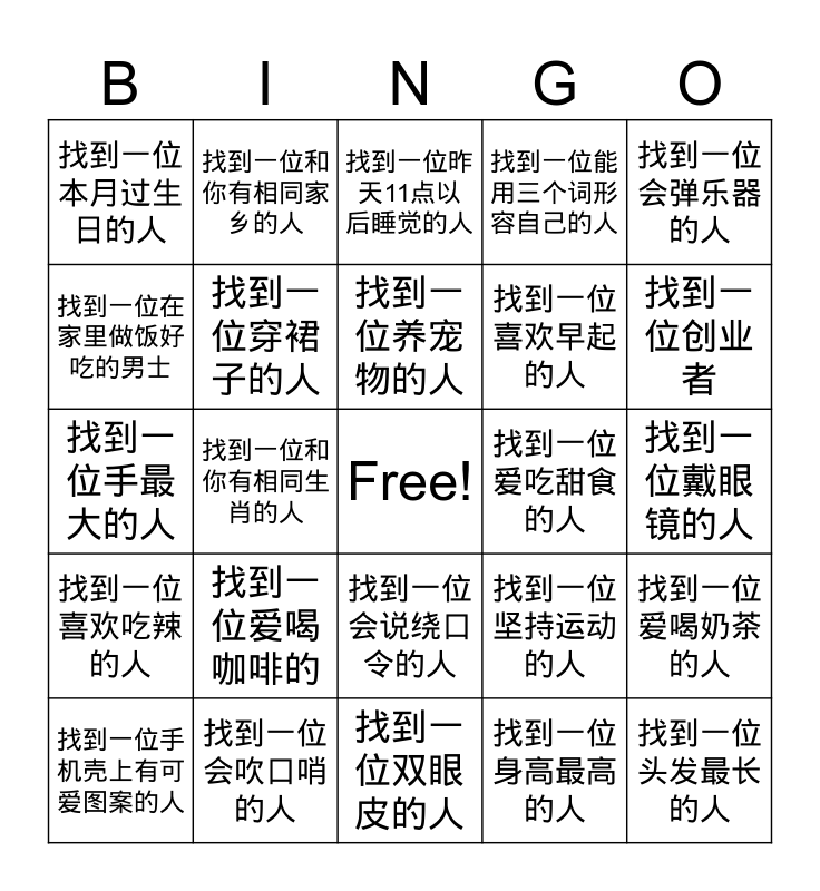 This bingo card has a free space and 24 words: 找到一位手机壳上有可爱图案的人, 找到一位爱喝咖啡的, 找到一位养宠物的人, 找到一位身高最高的人, 找到一位会弹乐器的人, 找到一位本月过生日的人, 找到一位和你有相同家乡的人, 找到一位昨天11点以后睡觉的人, 找到一位爱吃甜食的人, 找到一位戴眼镜的人, 找到一位手最大的人, 找到一位穿裙子的人, 找到一位坚持运动的人, 找到一位爱喝奶茶的人, 找到一位在家里做饭好吃的男士, 找到一位会吹口哨的人, 找到一位双眼皮的人, 找到一位能用三个词形容自己的人, 找到一位创业者, 找到一位喜欢吃辣的人, 找到一位和你有相同生肖的人, 找到一位会说绕口令的人, 找到一位喜欢早起的人 and 找到一位头发最长的人.