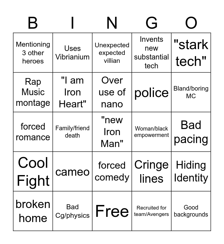 This bingo card has a free space and 24 words: cameo, Bad Cg/physics, Over use of nano, broken home, "stark tech", Mentioning 3 other heroes, Rap Music montage, Uses Vibrianium, Woman/black empowerment, forced comedy, police, forced romance, Cringe lines, Hiding Identity, "I am Iron Heart", Recruited for team/Avengers, Bad pacing, Unexpected expected villian, Bland/boring MC, Family/friend death, Good backgrounds, Cool Fight, Invents new substantial tech and Free.