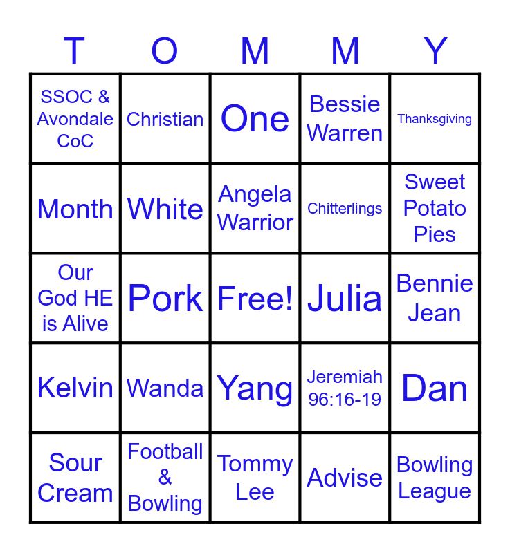 This bingo card has a free space and 38 words: Alabama, Three, Avondale CoC, White, Dan, Wanda, Angela Warrior, Chicken, Thanksgiving, Chitterlings, Pork, Bessie Warren, Bowling League, Bennie Jean, Month, Kelvin, Patrick, One, Handwriting, Julia, SSOC & Avondale CoC, Football & Bowling, Sweet Potato Pies, Sour Cream, Three and half Miles, Tommy Lee, Basement, Communion, Ann Moore, Mow their Lawn, One Hundred Six, Yang, Advise, Christian, Blue, Jeremiah 96:16-19, Our God HE is Alive and Philippians 4:13.