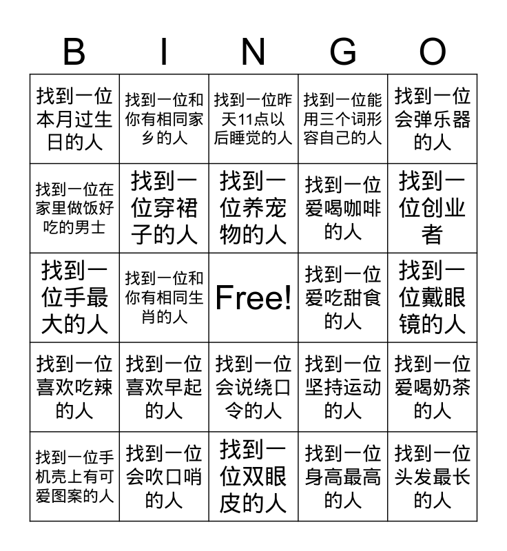 This bingo card has a free space and 24 words: 找到一位手机壳上有可爱图案的人, 找到一位喜欢早起的人, 找到一位养宠物的人, 找到一位身高最高的人, 找到一位会弹乐器的人, 找到一位本月过生日的人, 找到一位和你有相同家乡的人, 找到一位昨天11点以后睡觉的人, 找到一位爱吃甜食的人, 找到一位戴眼镜的人, 找到一位手最大的人, 找到一位穿裙子的人, 找到一位坚持运动的人, 找到一位爱喝奶茶的人, 找到一位在家里做饭好吃的男士, 找到一位会吹口哨的人, 找到一位双眼皮的人, 找到一位能用三个词形容自己的人, 找到一位创业者, 找到一位喜欢吃辣的人, 找到一位和你有相同生肖的人, 找到一位会说绕口令的人, 找到一位爱喝咖啡的人 and 找到一位头发最长的人.