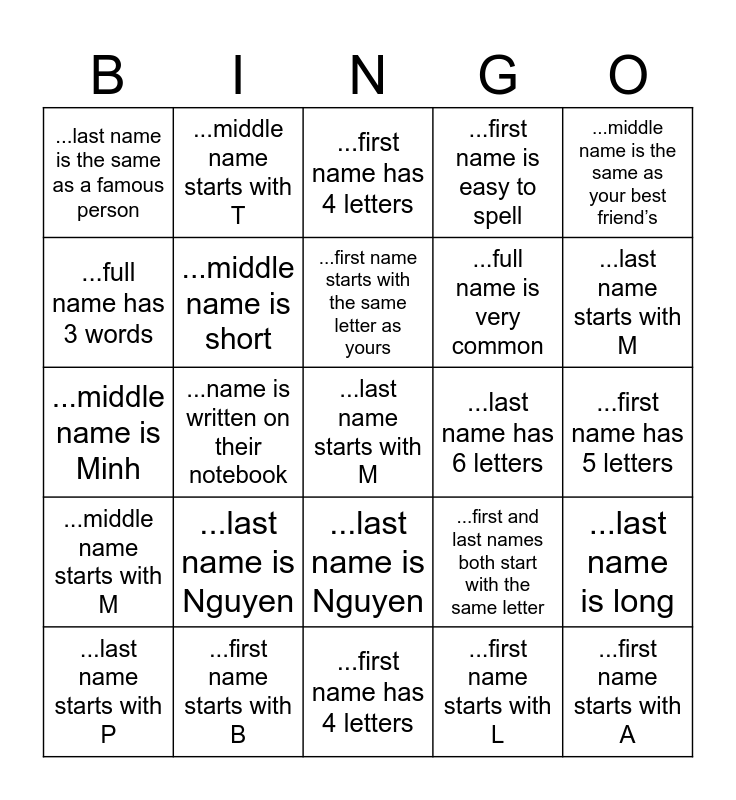 This bingo card has 50 words: ...first name starts with A, ...last name starts with M, ...middle name is Van, ...first name has 4 letters, ...last name is Nguyen, ...first name is the same as yours, ...middle name starts with T, ...last name ends with N, ...full name has 3 words, ...first name is hard to spell, ...middle name is short, ...first name is easy to spell, ...last name is long, ...first and last names both start with the same letter, ...full name has more than 15 letters, ...last name is not Vietnamese, ...first name starts with the same letter as yours, ...last name has 6 letters, ...first name ends with a vowel, ...middle name is the same as your best friend’s, ...name is written on their notebook, ...first name starts with L, ...last name is the same as a famous person, ...full name is very common, ...first name starts with a vowel (A, E, I, O, U), ...first name starts with A, ...last name starts with M, ...middle name is Van, ...first name has 4 letters, ...last name is Nguyen, ...first name is the same as yours, ...middle name starts with T, ...last name ends with N, ...full name has 3 words, ...first name starts with B, ...last name starts with T, ...middle name is Thi, ...middle name starts with H, ...first name starts with D, ...first name has 5 letters, ...last name starts with N, ...last name has 6 letters, ...first name starts with L, ...first name starts with C, ...last name starts with P, ...middle name is Minh, ...first name has 3 letters, ...last name is Tran, ...middle name starts with M and ...first name starts with H.