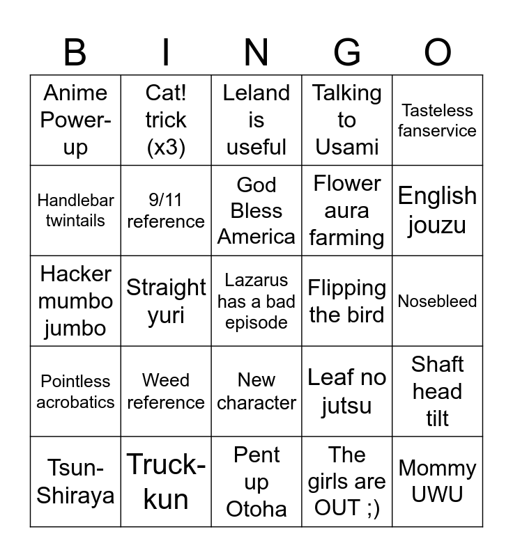 This bingo card has a free space and 27 words: Leaf no jutsu, Satoko abuse, Flower aura farming, Pent up Otoha, Handlebar twintails, Leland is useful, Cat! trick (x3), Pointless acrobatics, Flipping the bird, Shaft head tilt, Hacker mumbo jumbo, Talking to Usami, Tsun-Shiraya, Truck-kun, English jouzu, “Product” placement, 9/11 reference, God Bless America, Weed reference, Anime Power-up, Nosebleed, The girls are OUT ;), Straight yuri, Mommy UWU, New character, Tasteless fanservice and Ghibli food.