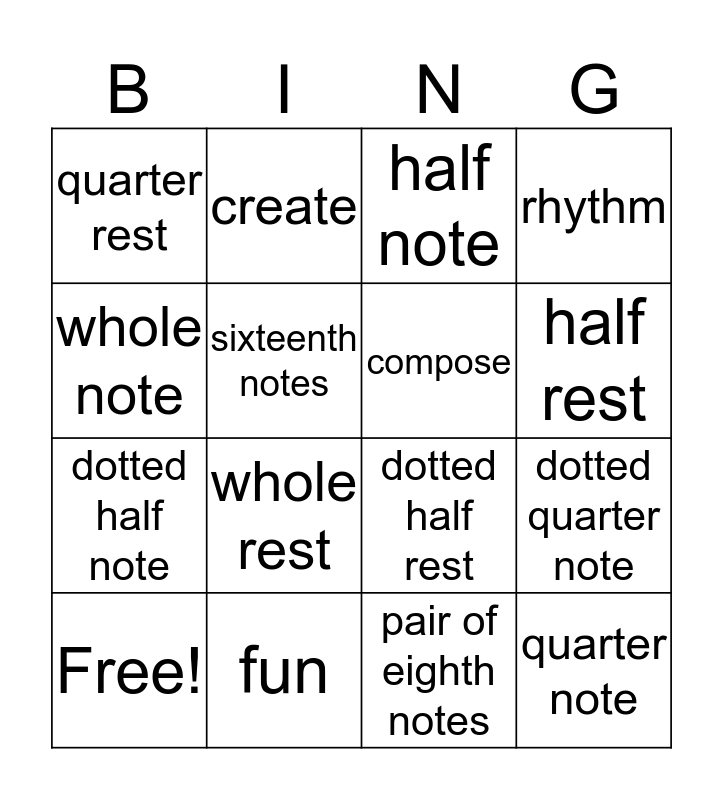 This bingo card has a free space and 15 words: Free!, quarter note, half note, quarter rest, half rest, whole note, whole rest, pair of eighth notes, sixteenth notes, dotted half note, dotted quarter note, rhythm, compose, create and fun.