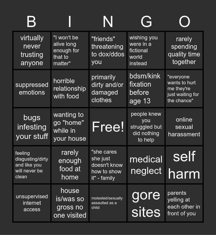 This bingo card has a free space and 24 words: rarely enough food at home, house is/was so gross no one visited, primarily dirty and/or damaged clothes, unsupervised internet access, rarely spending quality time together, virtually never trusting anyone, suppressed emotions, "I won't be alive long enough for that to matter", people knew you struggled but did nothing to help, "she cares she just doesn't know how to show it" - family, bdsm/kink fixation before age 13, bugs infesting your stuff, medical neglect, self harm, horrible relationship with food, gore sites, online sexual harassment, "friends" threatening to dox/ddos you, "everyone wants to hurt me they're just waiting for the chance", wanting to go "home" while in your house, parents yelling at each other in front of you, feeling disgusting/dirty and like you will never be clean, wishing you were in a fictional world instead and molested/sexually assaulted as a child.