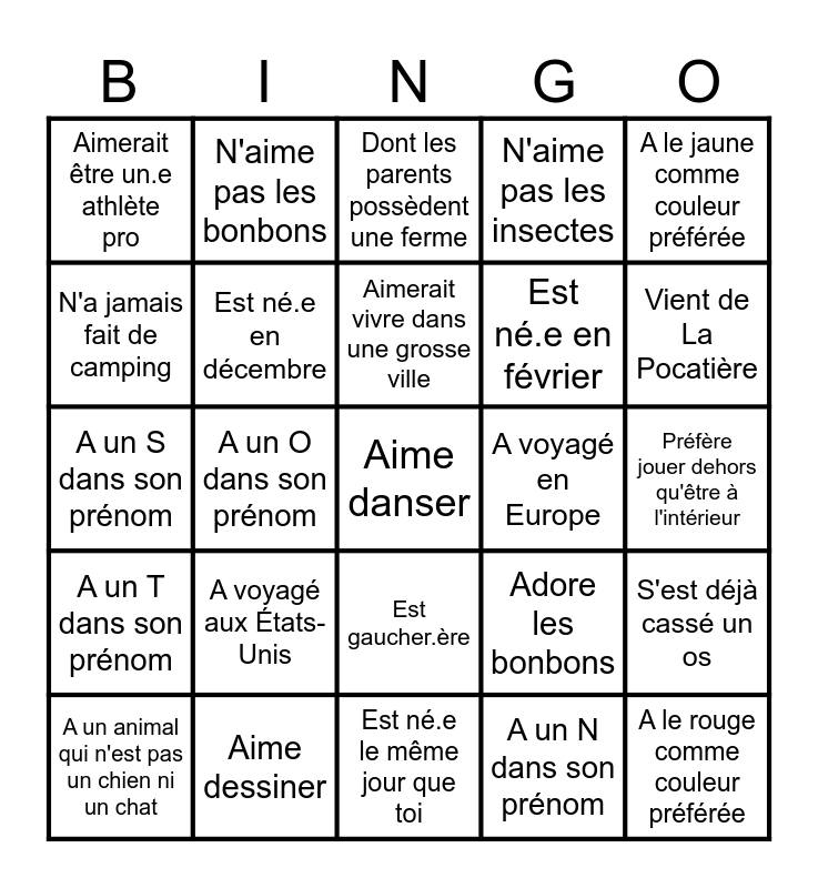 This bingo card has 135 words: Free!, A un chat, A un chien, A un frère plus vieux, A une soeur plus jeune, A déménagé au moins une fois, A un animal qui n'est pas un chien ni un chat, Est le ou la plus jeune de sa famille, S'est déjà cassé un os, Joue au même jeu que toi, Pratique le même sport que toi, Fait partie d'une équipe sportive, Joue d'un instrument de musique, A un frère plus jeune, A une soeur plus vielle, A un travail, A déjà vu le même film que toi, S'est déjà teint les cheveux, A des piercings, A une allergie, Est né.e le même jour que toi, Est né.e le même mois que toi, Dont les parents possèdent une ferme, Fait du VTT, A les mêmes goûts musicaux que toi, A voyagé aux États-Unis, A voyagé en Europe, A voyagé dans le sud, A un H dans son prénom, A un M dans son prénom, A un T dans son prénom, A un S dans son prénom, A un N dans son prénom, A un O dans son prénom, A un D sans son prénom, A plus de 2 frères/ soeurs, Sait dire une phrase en espagnol, Sait dire 2 phrases en anglais, A déjà fait la vaisselle, A déjà jeté un déchet qui traînait par terre, Aime danser, Aime le basketball, Aime le hockey, A une montre, Est enfant unique, Aime dessiner, Aime cuisiner, Aime pêcher, Est gaucher.ère, Aime les fruits de mer, Préfère la bouffe salée à celle sucrée, Préfère la nourriture sucrée à celle salée, Aime les légumes, Aime se déguiser, A déjà lu un livre pour le plaisir, Fait du vélo, A vu un film au cinéma récemment, Connaît un même youtuber/ tiktoker que toi, A le vert comme couleur préférée, A le bleu comme couleur préférée, A le rouge comme couleur préférée, A le jaune comme couleur préférée, A le brun comme couleur préférée, A le rose comme couleur préférée, A l'orange comme couleur préférée, A le noir comme couleur préférée, Aime les insectes, Aime faire du sport, Est patient.e, N'aime pas les bonbons, Adore les bonbons, Préfère jouer dehors qu'être à l'intérieur, Aime les jeux de mots, Aime les jeux vidéos, Aime les jeux de société, A déjà vu des extra-terrestres, Aimerait vivre dans une grosse ville, Aimerait devenir célèbre, Aimerait être un.e athlète pro, Aimerait aller dans l'espace, Aimerait explorer le fond de l'océan, N'aime pas les insectes, A le vertige, Préfère prendre sa douche le soir, Préfère prendre sa douche le matin, Aime le même genre de musique que toi, Aime le chocolat, N'aime pas se baigner, A déjà gagné un prix, A déjà gagné un concours, Aime faire du camping, N'a jamais fait de camping, A le même nombre de lettre dans son prénom que toi, Est plus vieux que toi, Est plus jeune que toi, Préfère se lever tôt que se coucher tard, Préfère se coucher tard que se lever tôt, A un talent caché, A une passion, A déjà pris un bébé dans ses bras, Est né.e en janvier, Est né.e en février, Est né.e en mars, Est né.e en avril, Est né.e en mai, Est né.e en juin, Est né.e en juillet, Est né.e en août, Est né.e en septembre, Est né.e en octobre, Est né.e en novembre, Est né.e en décembre, Aime bricoler, Aime les sensations fortes, Écoute de la musique à tous les jours, A déjà pris l'avion, Aime lire, Est capable de faire une roue, A mangé de la crème glacée dans la dernière semaine, Aime parler, Aime toujours être en mouvement, Aime se poser et rien faire, Aime aider les autres, Est bordélique, Est un peu gêné.e hihi :|, N'aime pas la poutine, N'aime pas le chocolat, A l'hiver comme saison préférée, A l'automne comme saison préférée, A l'été comme saison préférée, A le printemps comme saison préférée, Aime chanter, Déteste chanter, Vient de La Pocatière and Vient d'une autre municipalité que La Pocatière.