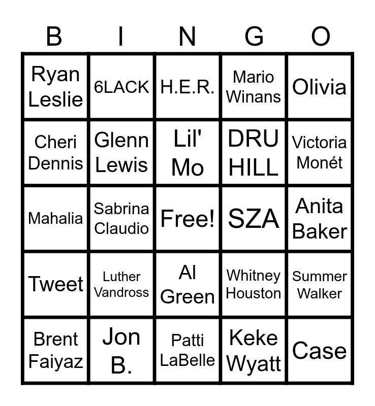 This bingo card has a free space and 61 words: Sunshine Anderson, Jon B., Tamia, Tweet, Keke Wyatt, Donell Jones, Glenn Lewis, Amerie, DRU HILL, Truth Hurts, Mario Winans, Sammie, Cheri Dennis, Brooke Valentine, Lloyd, Ryan Leslie, Case, Olivia, Joi, Lil' Mo, SZA, H.E.R., Brent Faiyaz, Summer Walker, Giveon, Daniel Caesar, Jhené Aiko, Lucky Daye, Victoria Monét, Jazmine Sullivan, Chloe x Halle, Coco Jones, Ari Lennox, Ty Dolla $ign, 6LACK, Muni Long, PARTYNEXTDOOR, Sabrina Claudio, dvsn, Mahalia, Marvin Gaye, Luther Vandross, Anita Baker, Aretha Franklin, Whitney Houston, Chaka Khan, Teddy Pendergrass, Sade, The Isley Brothers, Al Green, Patti LaBelle, Gladys Knight & The Pips, Boyz II Men, Keith Sweat, Toni Braxton, Jodeci, New Edition, SWV, Brandy, Aaliyah and NEYO.