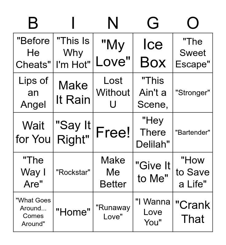 This bingo card has a free space and 35 words: What I've Done, Summer Love, Last Night, Make It Rain, Make Me Better, Ice Box, Lips of an Angel, Waiting on the World to Change, Lost Without U, I'm a Flirt, Wait for You, "The Sweet Escape", "Big Girls Don't Cry", "Buy U a Drank, "Before He Cheats", "Hey There Delilah", "I Wanna Love You", "Say It Right", "The Way I Are", "Crank That, "Give It to Me", "What Goes Around... Comes Around", "How to Save a Life", "Home", "My Love", "Stronger", "We Fly High", "Beautiful Girls", "This Ain't a Scene,, "Bartender", "Pop, Lock & Drop It", "Runaway Love", "Rockstar", "This Is Why I'm Hot" and "It's Not Over".
