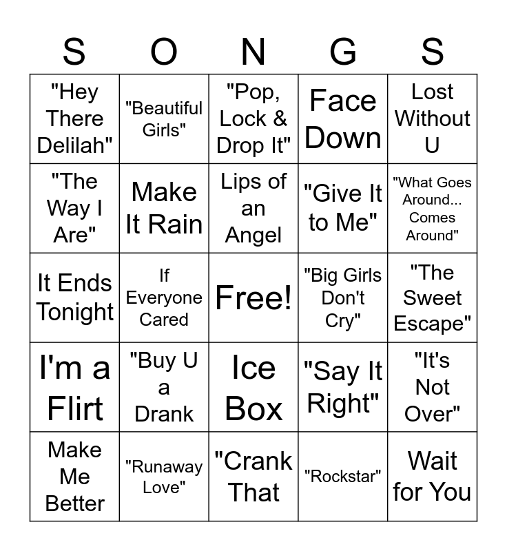 This bingo card has a free space and 39 words: What I've Done, Summer Love, Last Night, Make It Rain, Make Me Better, Ice Box, Lips of an Angel, Waiting on the World to Change, Lost Without U, I'm a Flirt, If Everyone Cared, Face Down, Wait for You, "The Sweet Escape", "Big Girls Don't Cry", "Buy U a Drank, "Before He Cheats", "Hey There Delilah", "I Wanna Love You", "Say It Right", "The Way I Are", "Crank That, "Give It to Me", "What Goes Around... Comes Around", "How to Save a Life", "Home", "My Love", "Stronger", "We Fly High", "Beautiful Girls", "This Ain't a Scene,, "Bartender", "Pop, Lock & Drop It", "Runaway Love", "Rockstar", "This Is Why I'm Hot", "It's Not Over", It Ends Tonight and I Tried.