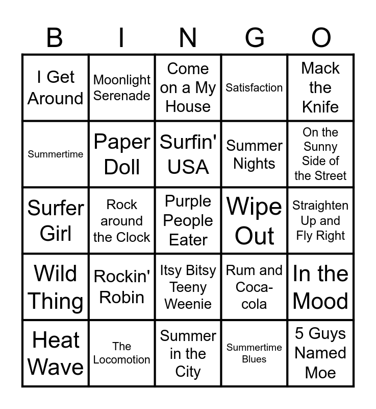 This bingo card has 25 words: Rockin' Robin, Summer in the City, Surfin' USA, Heat Wave, Mack the Knife, I Get Around, Summertime, Moonlight Serenade, Wipe Out, Itsy Bitsy Teeny Weenie, Summer Nights, Surfer Girl, Rum and Coca-cola, In the Mood, Paper Doll, 5 Guys Named Moe, Straighten Up and Fly Right, Come on a My House, On the Sunny Side of the Street, Rock around the Clock, Purple People Eater, The Locomotion, Wild Thing, Satisfaction and Summertime Blues.