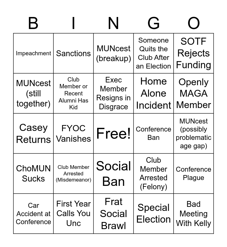 This bingo card has a free space and 24 words: Club Member Arrested (Misdemeanor), First Year Calls You Unc, Exec Member Resigns in Disgrace, Car Accident at Conference, SOTF Rejects Funding, Impeachment, MUNcest (still together), Sanctions, Conference Ban, Social Ban, Home Alone Incident, Casey Returns, Club Member Arrested (Felony), Conference Plague, Club Member or Recent Alumni Has Kid, Special Election, MUNcest (possibly problematic age gap), MUNcest (breakup), Openly MAGA Member, FYOC Vanishes, Bad Meeting With Kelly, ChoMUN Sucks, Someone Quits the Club After an Election and Frat Social Brawl.