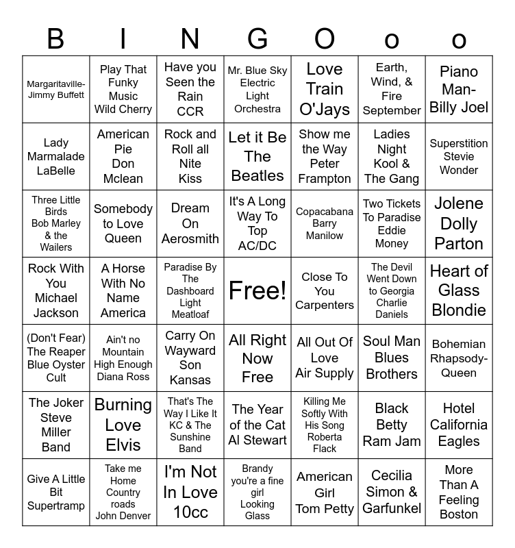 This bingo card has a free space and 84 words: Dreams Fleetwood Mac, The Year of the Cat Al Stewart, Have you Seen the Rain CCR, Take me Home Country roads John Denver, Tiny Dancer Elton John, Dancing Queen- Abba, Burning Love Elvis, Lean on me Bill Withers, The Joker Steve Miller Band, Brandy you're a fine girl Looking Glass, Free Bird Lynyrd Skynyrd, Let's Stay Together- Al Green, Piano Man- Billy Joel, Superstition Stevie Wonder, The Boys Are Back In Town Thin Lizzy, Margaritaville- Jimmy Buffett, Jolene Dolly Parton, Earth, Wind, & Fire September, Imagine John Lennon, All Right Now Free, Bohemian Rhapsody- Queen, American Pie Don Mclean, Ladies Night Kool & The Gang, Roxanne The Police, Show me the Way Peter Frampton, Love Hurts Nazareth, American Girl Tom Petty, Behind Blue Eyes The Who, I'll be There Jackson 5, Knocking on Heavens Door Bob Dylan, Dream On Aerosmith, Reelin In The Years Steely Dan, All Out Of Love Air Supply, Let it Be The Beatles, More Than A Feeling Boston, The Devil Went Down to Georgia Charlie Daniels, A Horse With No Name America, Some Kind of Wonderful Grand Funk Railroad, Rock and Roll all Nite Kiss, Somebody to Love Queen, Ain't no Mountain High Enough Diana Ross, Soul Man Blues Brothers, Born to Run Bruce Springsteen, My Sharona The Knack, Give A Little Bit Supertramp, Hotel California Eagles, Play That Funky Music Wild Cherry, Killing Me Softly With His Song Roberta Flack, Rich Girl Hall & Oates, Barracuda Heart, Carry On Wayward Son Kansas, Copacabana Barry Manilow, Mr. Blue Sky Electric Light Orchestra, It's Too Late Carole King, Stayin Alive Bee Gees, Easy Commodores, Rock With You Michael Jackson, Lady Marmalade LaBelle, Sweet Emotion Aerosmith, Three Little Birds Bob Marley & the Wailers, La Grange ZZ Top, I Can See Clearly Now Johnny Nash, Midnight Train To Georgia Gladys Knight & The Pips, Black Magic Woman Santana, Lowdown Boz Scaggs, (Don't Fear) The Reaper Blue Oyster Cult, Hold the Line Toto, Immigrant Song Led Zeppelin, Love Train O'Jays, Wonderful Tonight Eric Clapton, Two Tickets To Paradise Eddie Money, Walk On The Wild Side Lou Reed, Black Betty Ram Jam, Lights Journey, It's A Long Way To Top AC/DC, Paradise By The Dashboard Light Meatloaf, I Want You To Want Me Cheap Trick, Cecilia Simon & Garfunkel, Amie Pure Prairie League, Heart of Glass Blondie, Close To You Carpenters, I'm Not In Love 10cc, That's The Way I Like It KC & The Sunshine Band and Best Of My Love The Emotions.