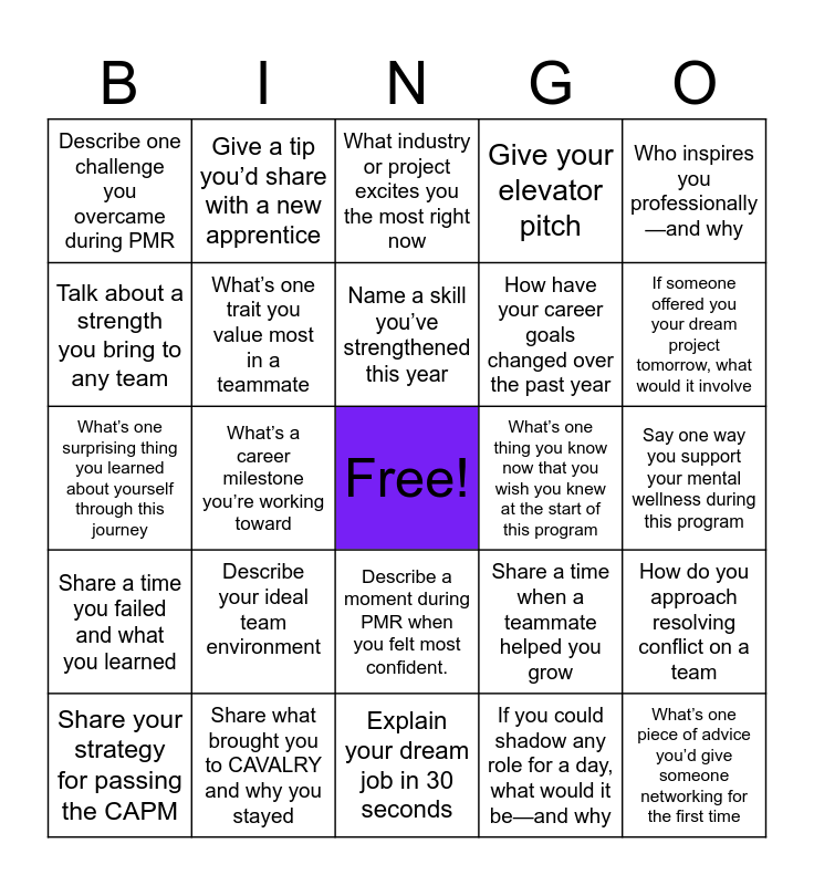 This bingo card has a free space and 24 words: Describe your ideal team environment, Share what brought you to CAVALRY and why you stayed, Name a skill you’ve strengthened this year, Share your strategy for passing the CAPM, Who inspires you professionally—and why, Describe one challenge you overcame during PMR, Talk about a strength you bring to any team, Give a tip you’d share with a new apprentice, What’s one thing you know now that you wish you knew at the start of this program, Describe a moment during PMR when you felt most confident., How have your career goals changed over the past year, What’s one surprising thing you learned about yourself through this journey, Share a time when a teammate helped you grow, How do you approach resolving conflict on a team, What’s one trait you value most in a teammate, If you could shadow any role for a day, what would it be—and why, Say one way you support your mental wellness during this program, What industry or project excites you the most right now, If someone offered you your dream project tomorrow, what would it involve, What’s a career milestone you’re working toward, What’s one piece of advice you’d give someone networking for the first time, Share a time you failed and what you learned, Give your elevator pitch and Explain your dream job in 30 seconds.