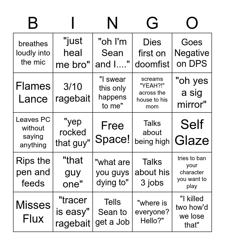 This bingo card has a free space and 24 words: "that guy one", "tracer is easy" ragebait, "I swear this only happens to me", Misses Flux, Goes Negative on DPS, breathes loudly into the mic, Flames Lance, "just heal me bro", Talks about being high, "what are you guys dying to", screams "YEAH?!" across the house to his mom, Leaves PC without saying anything, Talks about his 3 jobs, tries to ban your character you want to play, 3/10 ragebait, "where is everyone? Hello?", Self Glaze, "oh I'm Sean and I....", "oh yes a sig mirror", "yep rocked that guy", "I killed two how'd we lose that", Rips the pen and feeds, Dies first on doomfist and Tells Sean to get a Job.