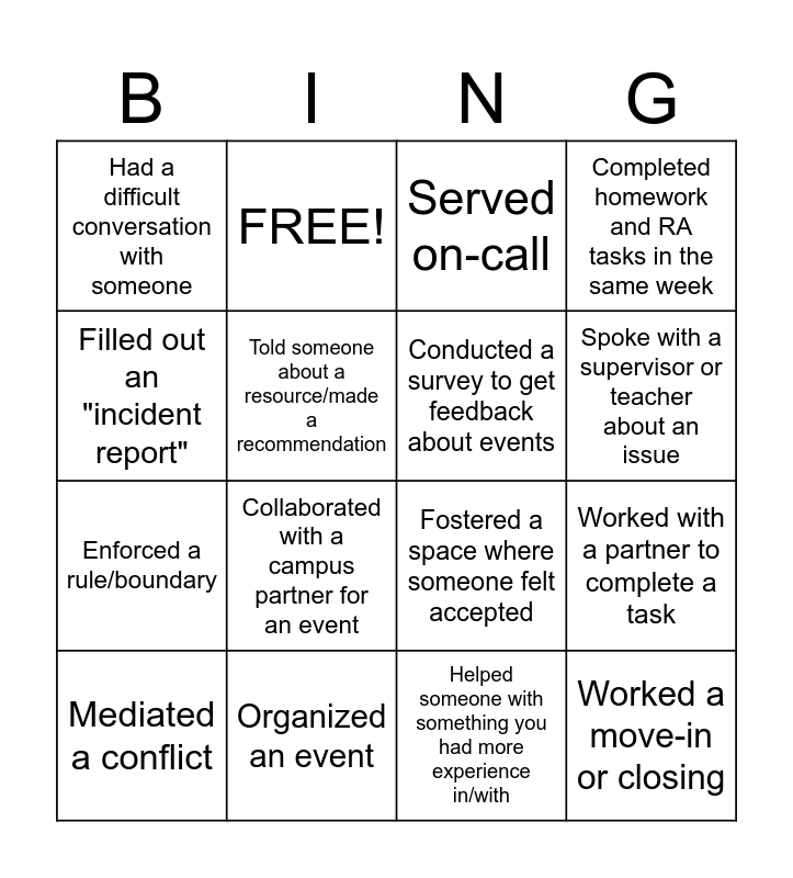 This bingo card has 16 words: Mediated a conflict, Organized an event, Served on-call, Completed homework and RA tasks in the same week, Filled out an "incident report", FREE!, Fostered a space where someone felt accepted, Worked with a partner to complete a task, Had a difficult conversation with someone, Told someone about a resource/made a recommendation, Helped someone with something you had more experience in/with, Spoke with a supervisor or teacher about an issue, Enforced a rule/boundary, Collaborated with a campus partner for an event, Conducted a survey to get feedback about events and Worked a move-in or closing.