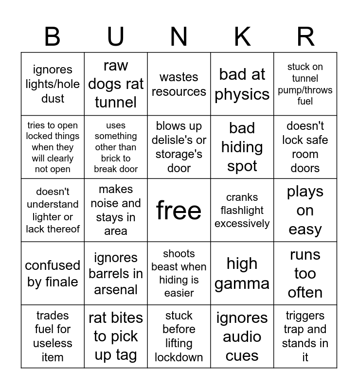 This bingo card has a free space and 24 words: ignores barrels in arsenal, rat bites to pick up tag, blows up delisle's or storage's door, trades fuel for useless item, stuck on tunnel pump/throws fuel, ignores lights/hole dust, tries to open locked things when they will clearly not open, raw dogs rat tunnel, cranks flashlight excessively, shoots beast when hiding is easier, bad hiding spot, doesn't understand lighter or lack thereof, high gamma, runs too often, uses something other than brick to break door, ignores audio cues, plays on easy, wastes resources, doesn't lock safe room doors, makes noise and stays in area, triggers trap and stands in it, confused by finale, bad at physics and stuck before lifting lockdown.