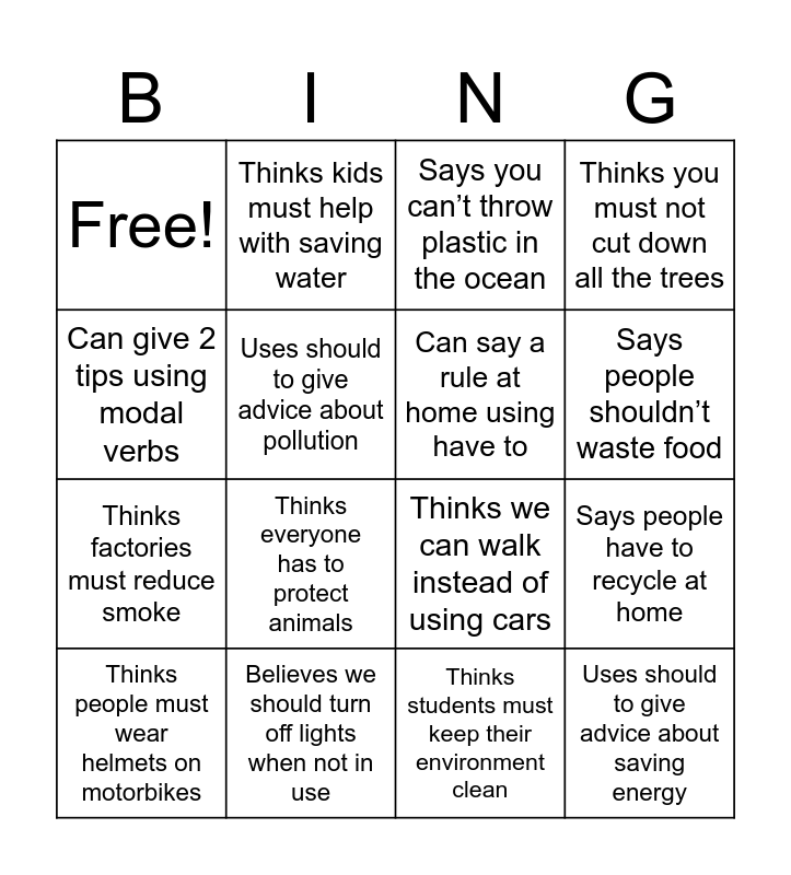 This bingo card has 16 words: Thinks people must wear helmets on motorbikes, Believes we should turn off lights when not in use, Says you can’t throw plastic in the ocean, Thinks you must not cut down all the trees, Can give 2 tips using modal verbs, Thinks kids must help with saving water, Thinks we can walk instead of using cars, Says people have to recycle at home, Free!, Uses should to give advice about pollution, Thinks students must keep their environment clean, Says people shouldn’t waste food, Thinks factories must reduce smoke, Thinks everyone has to protect animals, Can say a rule at home using have to and Uses should to give advice about saving energy.