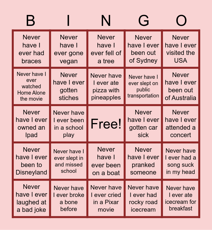 This bingo card has a free space and 24 words: Never have I ever slept in and missed school, Never have I ever broke a bone before, Never have I ever ate pizza with pineapples, Never have I ever laughed at a bad joke, Never have I ever visited the USA, Never have I ever had braces, Never have I ever watched Home Alone the movie, Never have I ever gone vegan, Never have I ever gotten car sick, Never have I ever been on a boat, Never have I ever slept on public transportation, Never have I ever owned an Ipad, Never have I ever pranked someone, Never have I ever had a song suck in my head, Never have I ever gotten stiches, Never have I ever had rocky road icecream, Never have I ever attended a concert, Never have I ever fell of a tree, Never have I ever been out of Australia, Never have I ever been in a school play, Never have I ever ate icecream for breakfast, Never have I ever been to Disneyland, Never have I ever been out of Sydney and Never have I ever cried in a Pixar movie.