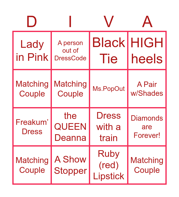 This bingo card has 20 words: Matching Couple, A Dress made of Lace, Black Tie, Diamonds are Forever!, Mr.PutItOn, the QUEEN Deanna, Ruby (red) Lipstick, HIGH heels, Freakum’ Dress, A person out of DressCode, Dress with a train, A Pair w/Shades, Lady in Pink, A Show Stopper, Ms.PopOut, tall HIGH heels, Matching Couple, Matching Couple, Matching Couple and Matching Couple.