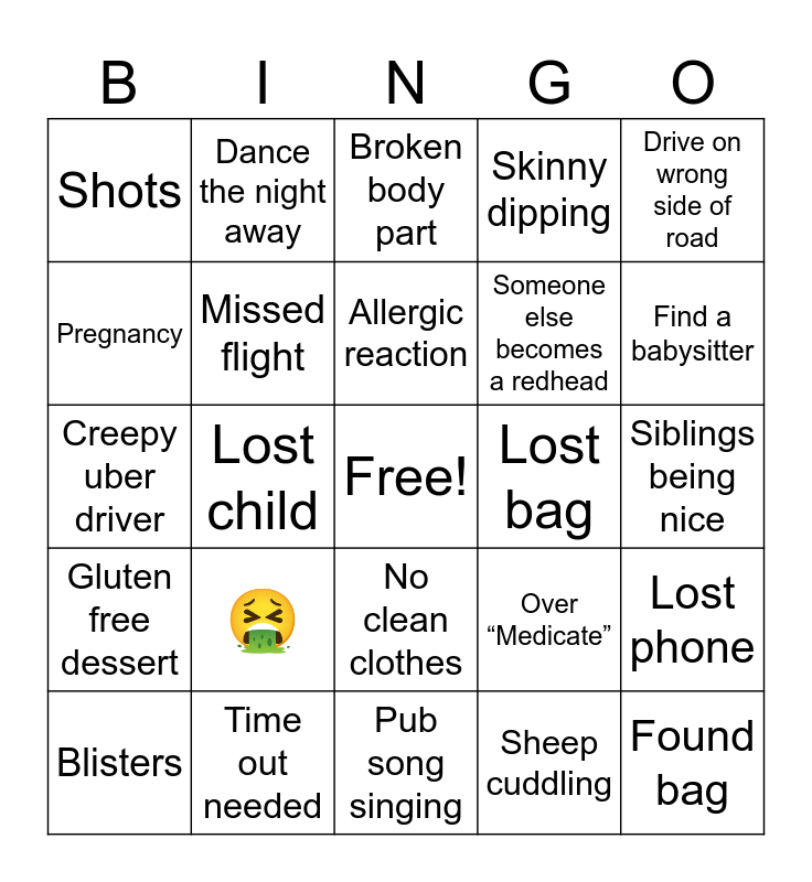 This bingo card has a free space and 24 words: 🤮, Time out needed, Allergic reaction, Blisters, Drive on wrong side of road, Shots, Pregnancy, Dance the night away, Lost bag, No clean clothes, Someone else becomes a redhead, Creepy uber driver, Over “Medicate”, Lost phone, Missed flight, Sheep cuddling, Siblings being nice, Broken body part, Find a babysitter, Lost child, Found bag, Gluten free dessert, Skinny dipping and Pub song singing.