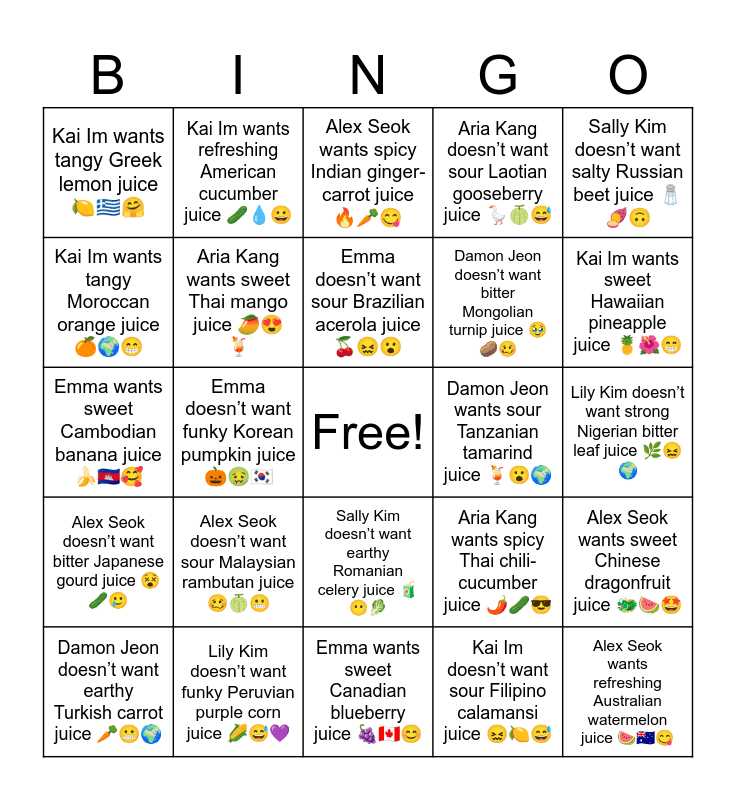 This bingo card has a free space and 34 words: Damon Jeon wants sweet Korean pear juice ๐๐ฅค๐, Kai Im doesnโt want sour Filipino calamansi juice ๐๐๐ , Lily Kim wants spicy Mexican tomato juice ๐ถ๏ธ๐ ๐, Emma wants tangy Vietnamese starfruit juice ๐๐น๐, Alex Seok doesnโt want bitter Japanese gourd juice ๐ต๐ฅ๐ฅฒ, Aria Kang wants sweet Thai mango juice ๐ฅญ๐๐น, Sally Kim doesnโt want salty Russian beet juice ๐ง๐ ๐, Damon Jeon doesnโt want earthy Turkish carrot juice ๐ฅ๐ฌ๐, Kai Im wants refreshing American cucumber juice ๐ฅ๐ง๐, Lily Kim wants sweet Chinese lychee juice ๐๐น๐, Emma doesnโt want sour Brazilian acerola juice ๐๐๐ฎ, Alex Seok wants spicy Indian ginger-carrot juice ๐ฅ๐ฅ๐, Aria Kang doesnโt want bitter Egyptian spinach juice ๐ฟ๐คข๐, Sally Kim wants sweet Korean strawberry juice ๐๐ฐ๐ทโบ๏ธ, Damon Jeon wants sour Tanzanian tamarind juice ๐น๐ฎ๐, Kai Im wants sweet Hawaiian pineapple juice ๐๐บ๐, Lily Kim doesnโt want funky Peruvian purple corn juice ๐ฝ๐ ๐, Emma wants sweet Cambodian banana juice ๐๐ฐ๐ญ๐ฅฐ, Alex Seok doesnโt want sour Malaysian rambutan juice ๐ฅด๐๐ฌ, Aria Kang wants spicy Thai chili-cucumber juice ๐ถ๏ธ๐ฅ๐, Sally Kim doesnโt want earthy Romanian celery juice ๐ง๐ถ๐ฅฌ, Damon Jeon wants sweet Ecuadorian passionfruit juice ๐๐น๐, Kai Im wants tangy Greek lemon juice ๐๐ฌ๐ท๐ค, Lily Kim doesnโt want strong Nigerian bitter leaf juice ๐ฟ๐๐, Emma wants sweet Canadian blueberry juice ๐๐จ๐ฆ๐, Alex Seok wants refreshing Australian watermelon juice ๐๐ฆ๐บ๐, Aria Kang doesnโt want sour Laotian gooseberry juice ๐ชฟ๐๐ , Sally Kim wants sweet Taiwanese guava juice ๐๐๐, Damon Jeon doesnโt want bitter Mongolian turnip juice ๐ฅน๐ฅ๐ฅด, Kai Im wants tangy Moroccan orange juice ๐๐๐, Lily Kim wants sweet Filipino papaya juice ๐ง๐ฅญ๐, Emma doesnโt want funky Korean pumpkin juice ๐๐คข๐ฐ๐ท, Alex Seok wants sweet Chinese dragonfruit juice ๐ฒ๐๐คฉ and Aria Kang wants sour Japanese yuzu juice ๐๐ฏ๐ต๐.