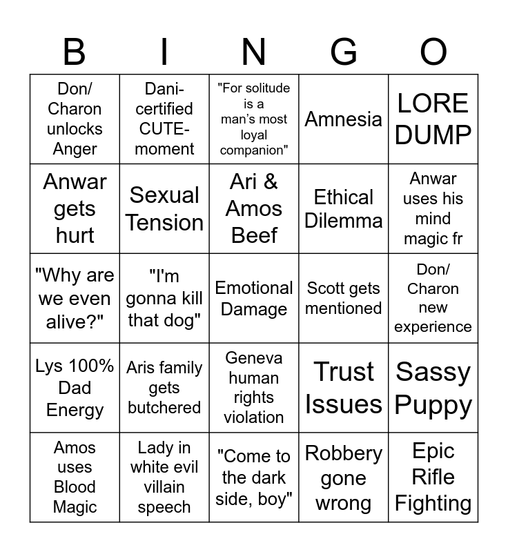 This bingo card has a free space and 24 words: Aris family gets butchered, Lady in white evil villain speech, Ari & Amos Beef, Amos uses Blood Magic, LORE DUMP, Don/ Charon unlocks Anger, Anwar gets hurt, Dani-certified CUTE-moment, Scott gets mentioned, Geneva human rights violation, Ethical Dilemma, "Why are we even alive?", Trust Issues, Sassy Puppy, Sexual Tension, Robbery gone wrong, Don/ Charon new experience, "For solitude is a man’s most loyal companion", Anwar uses his mind magic fr, "I'm gonna kill that dog", Epic Rifle Fighting, Lys 100% Dad Energy, Amnesia and "Come to the dark side, boy".
