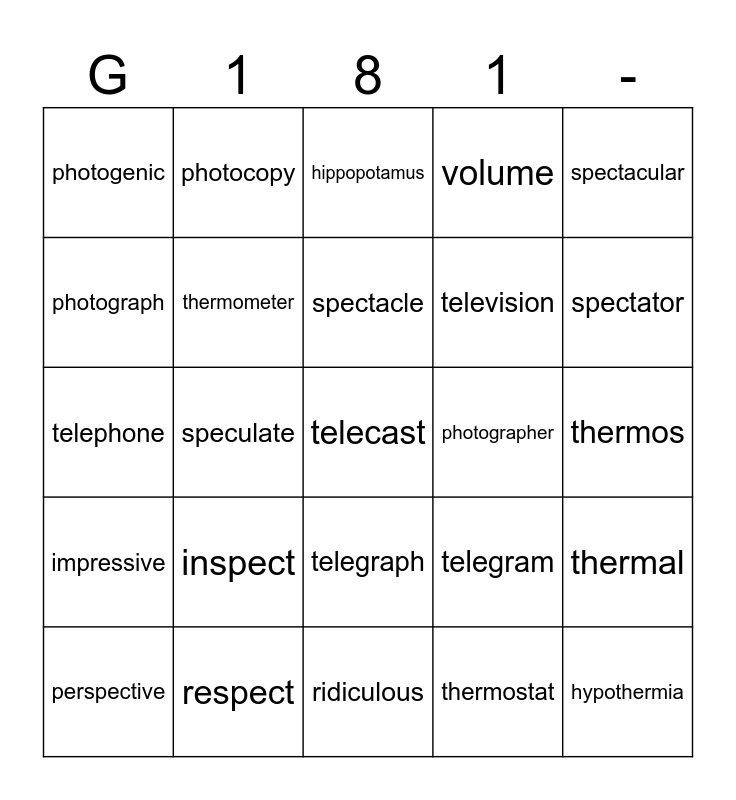This bingo card has a free space and 24 words: inspect, respect, spectacle, perspective, spectacular, photogenic, photograph, photocopy, photographer, telegraph, television, telephone, telegram, thermal, thermometer, thermostat, thermos, hippopotamus, spectator, speculate, hypothermia, impressive, volume and ridiculous.